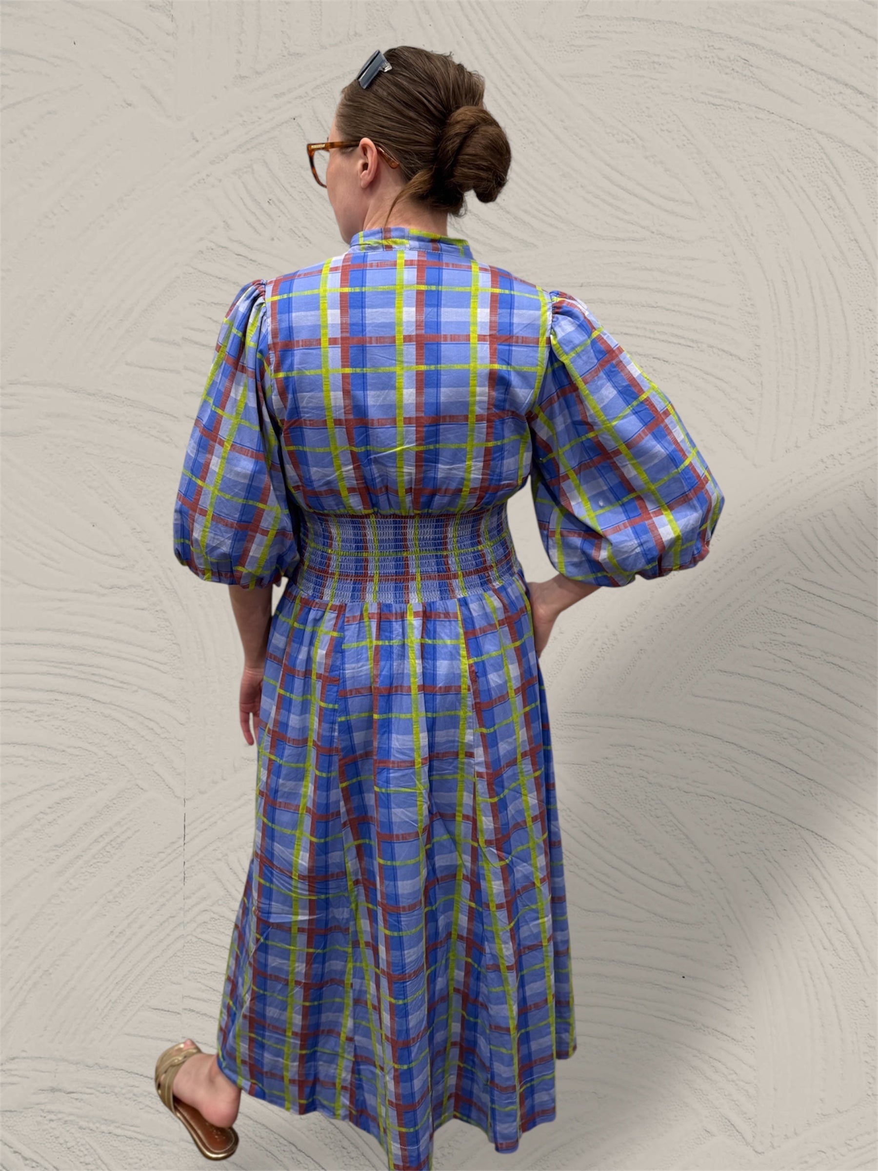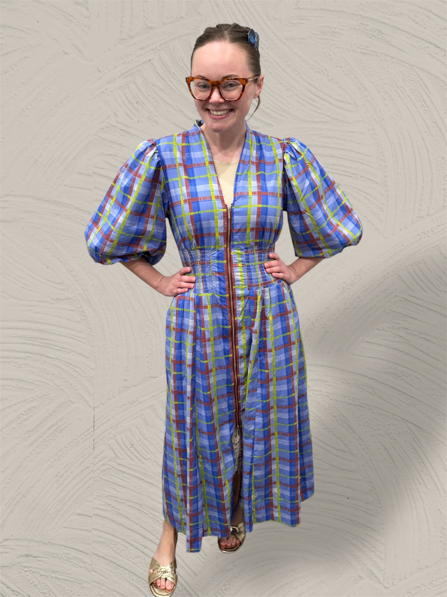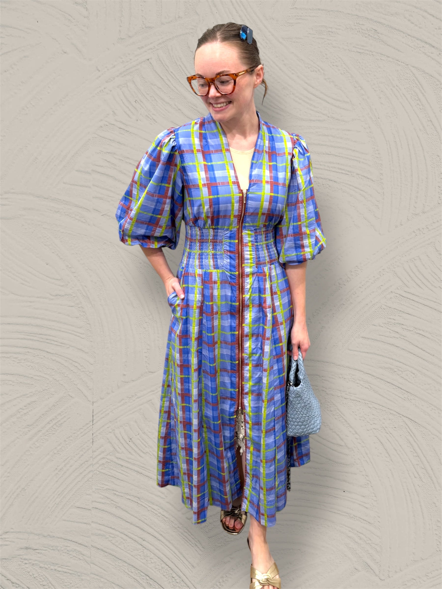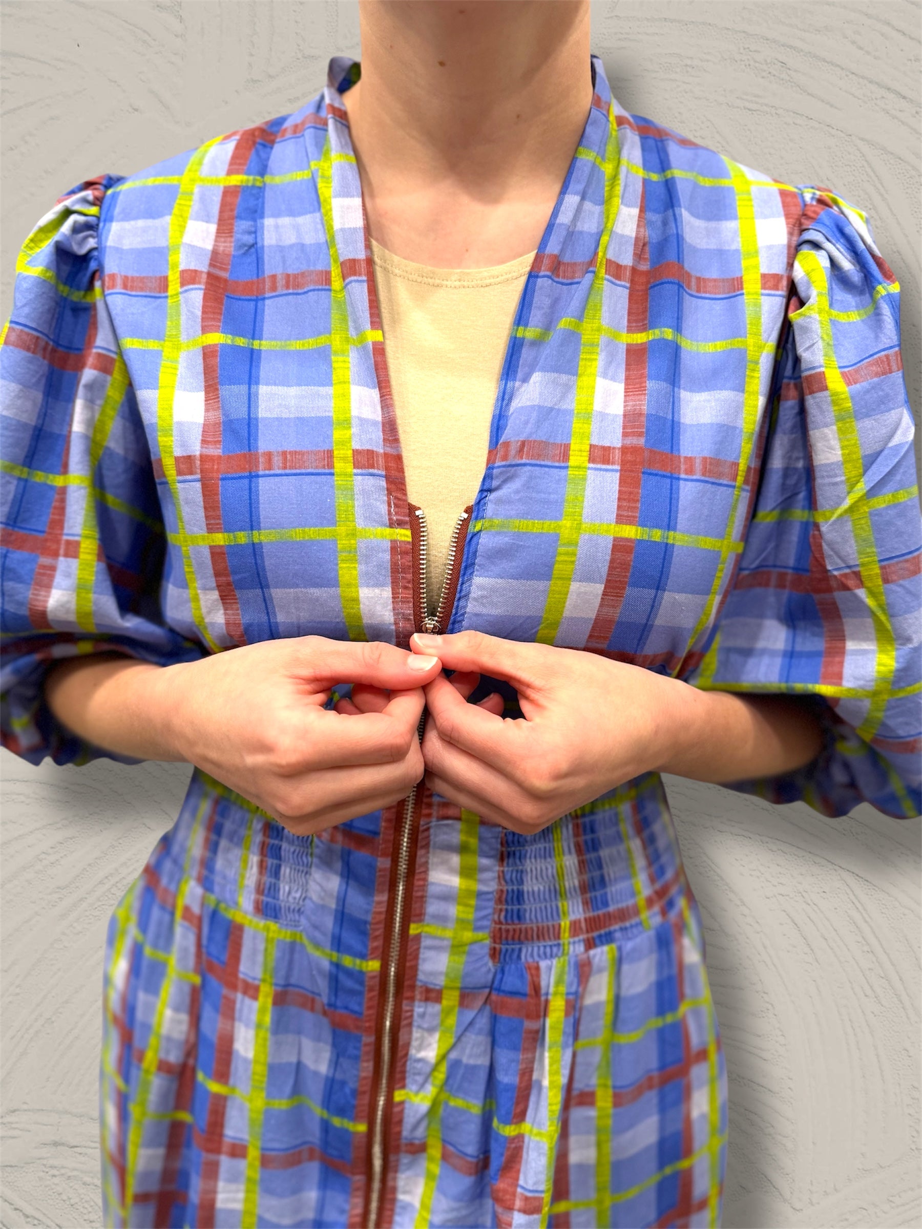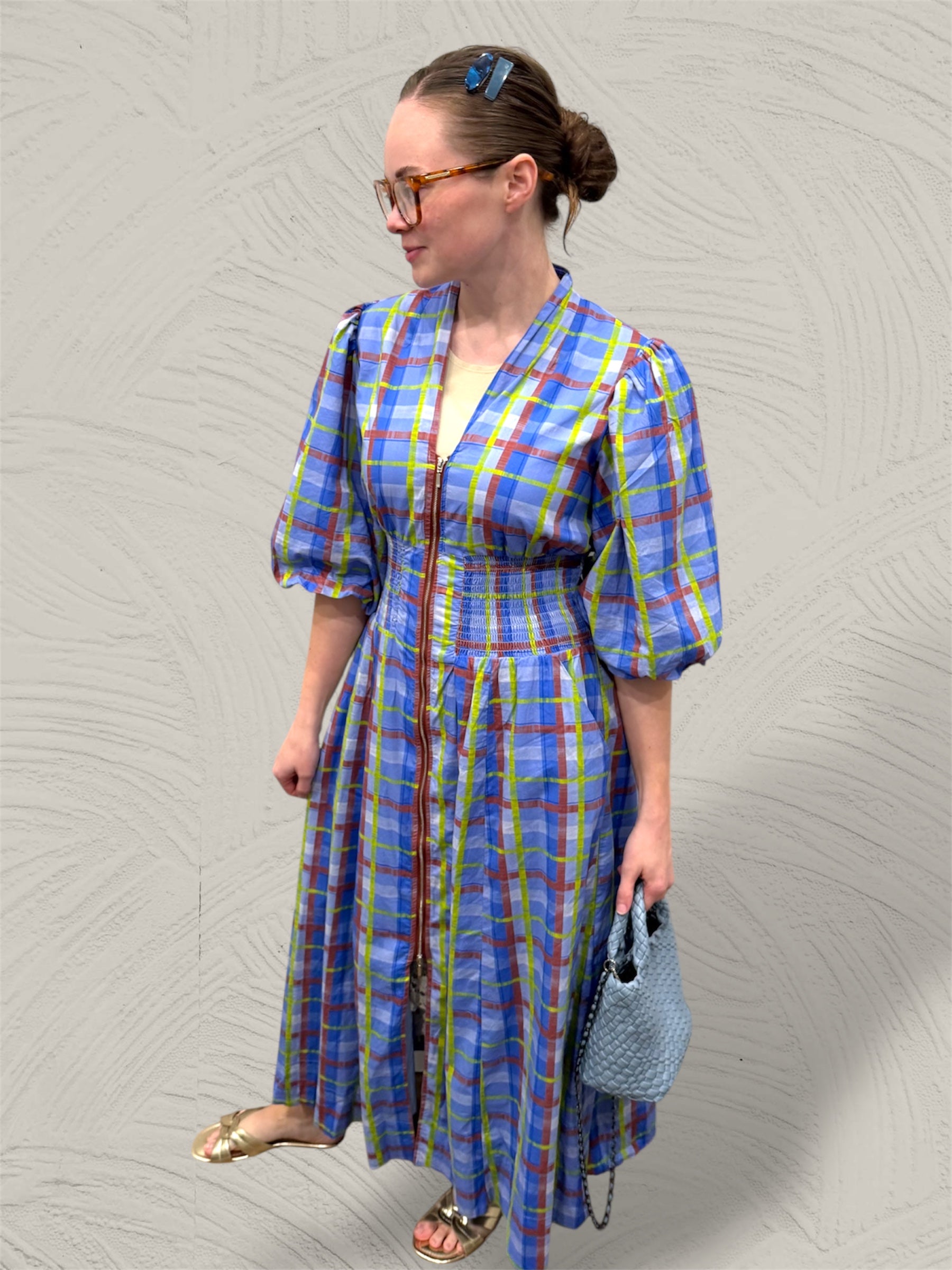 This dress is cut in a light, crisp cotton-blend shirting fabric printed in a bold, multi-color plaid of sky blue, royal blue, lime green and brick-red stripes on a pale blue ground. It has a softly notched, band-style neckline that opens into a full-length, two-way center-front zipper.